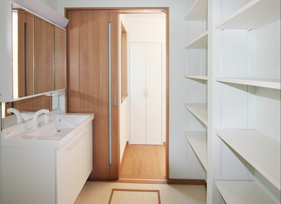 パウダールーム。壁面いっぱいの収納スペース。